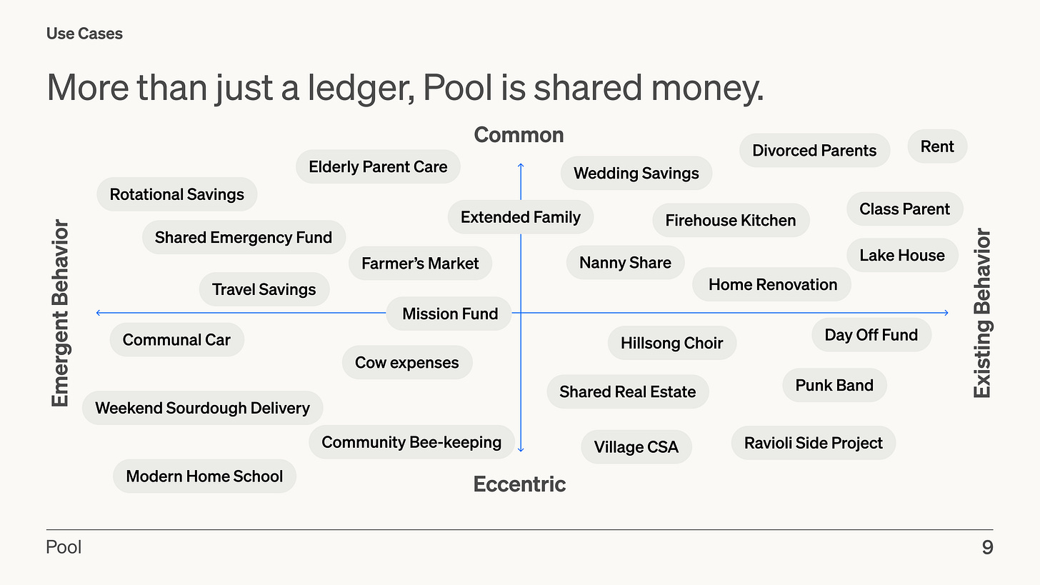 Ideal users of Pool could include PTA groups and college clubs, neighborhood HOAs and other communal groups, from farmers sharing livestock to the camps attending the Burning Man festival.