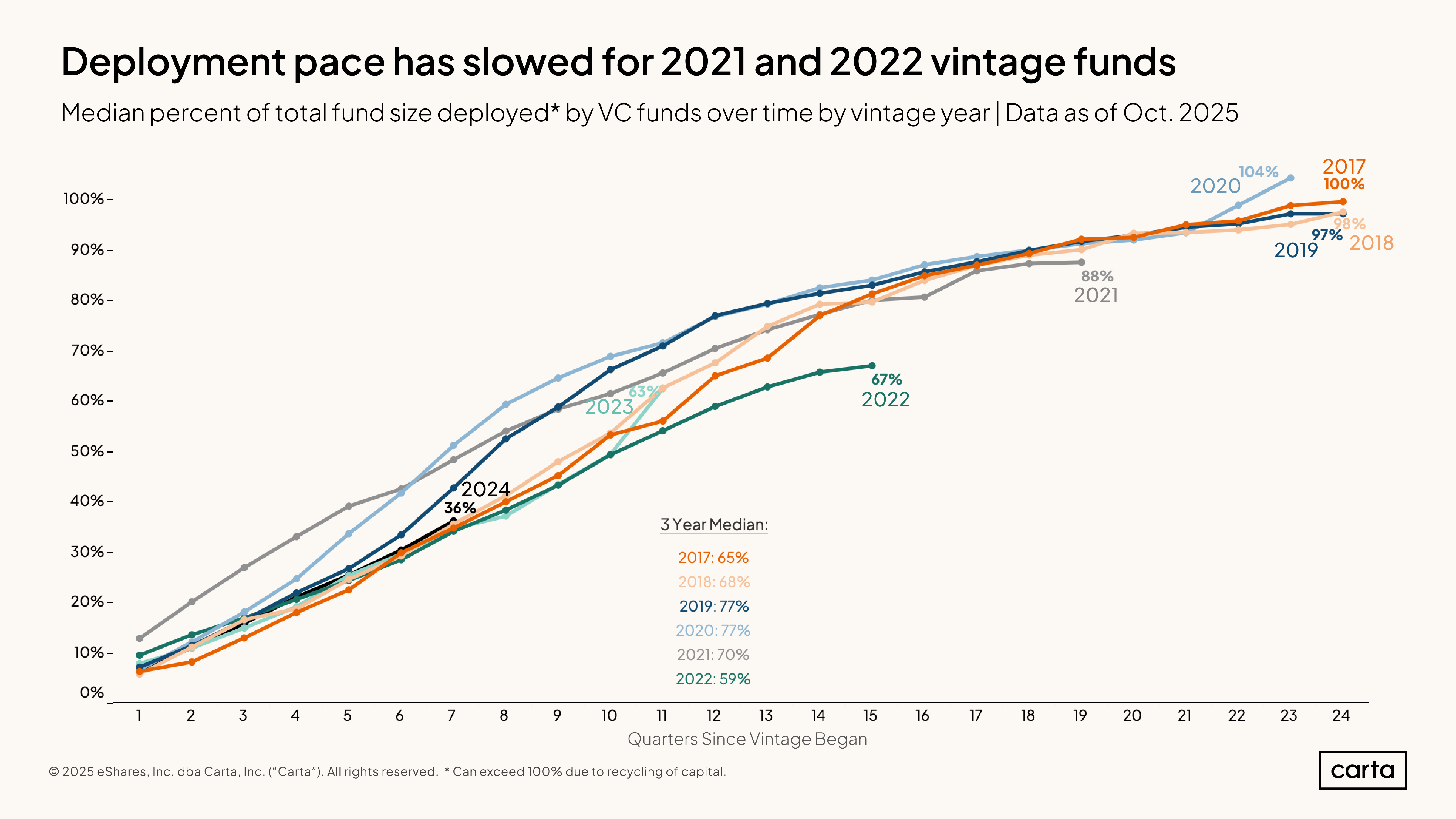 That’s not the situation with many newer funds: while 2023 vintages are tracking closer to 2022, funds raised in 2024 are tracking to deploy faster than historical norms, Carta found. AI-focused funds that have invested widely and quickly, and the blue-chip bigger firms with long track records are also notable exceptions.