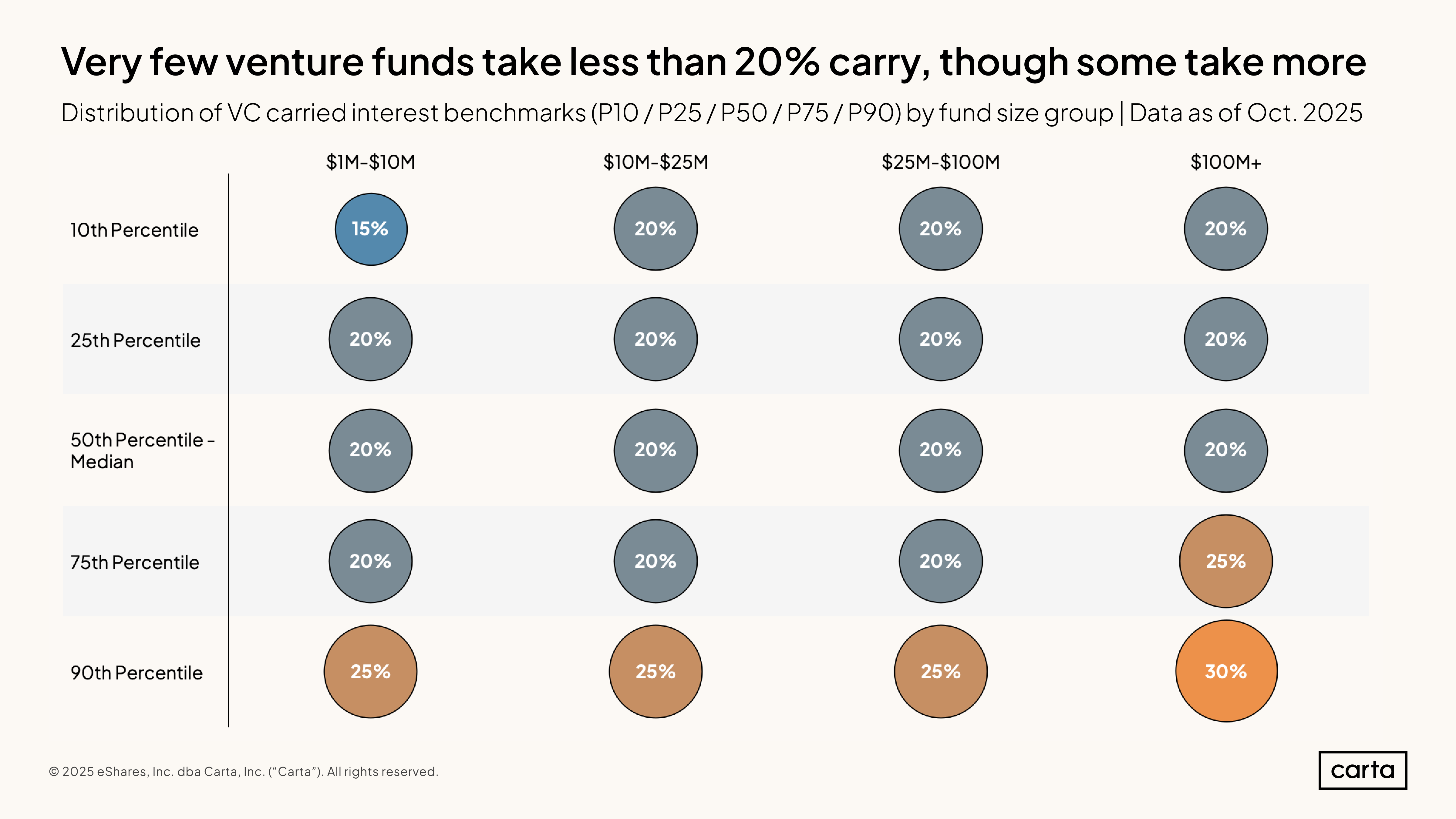 Fund structures flat: Firms are still mostly adhering to a 2-and-20 structure with fees and carried interest, with 90% percentile micro funds ($10 million or smaller) and giga funds ($100 million or larger) showing the most appetite to raise their carry to 25% or 30%.