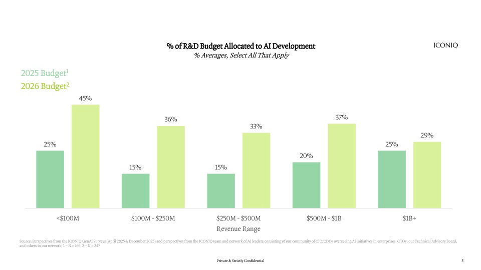 It’s not surprising that earlier stage startups spend more of their R&D budgets on AI. But for all but the biggest, these are pretty significant increases in percentage of spend.