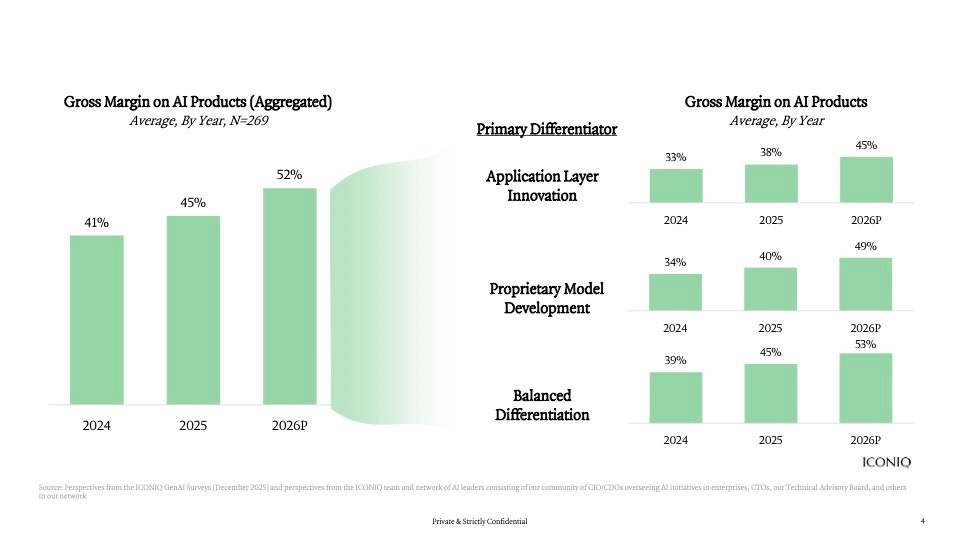 What they found: Gross margins are going up for AI products, from 41% in 2024 to 45% in 2025, and a projected 52% for 2026.