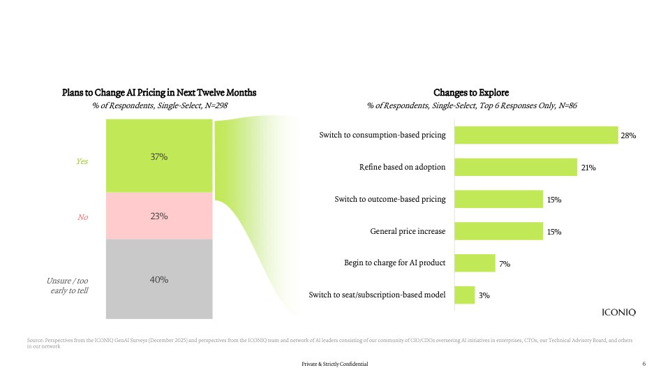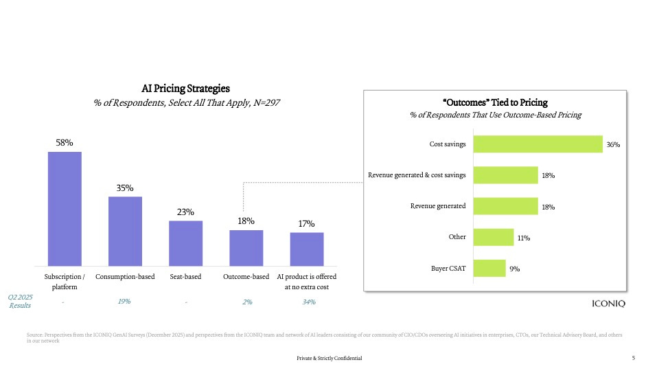 Subscription and per-seat models still rule among AI product builders, but you’re starting to see more interest in consumption and outcomes-based approaches.