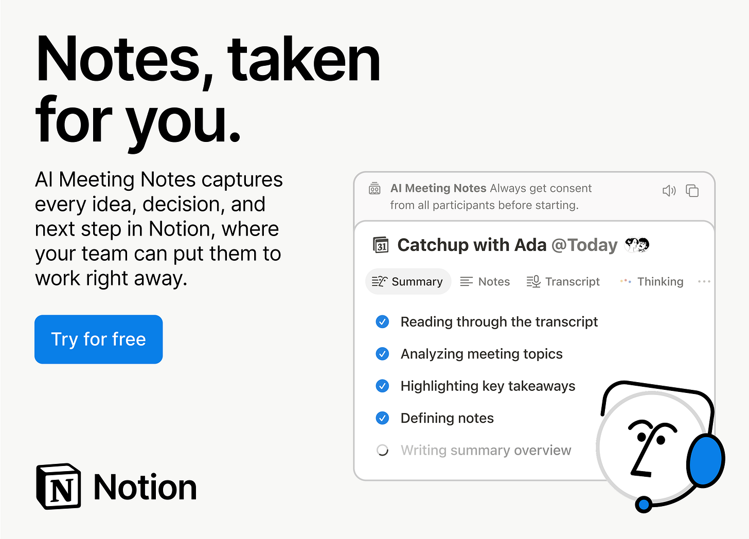 Perfect meeting notes. Every time. Focus on the conversation while Notion AI captures everything. Get instant summaries, action items, and decisions—all searchable in your workspace. Never lose another insight.