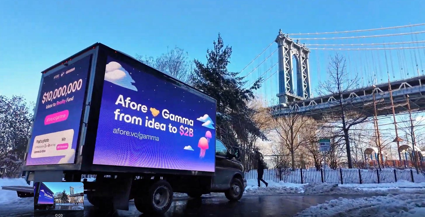 There’s a big marketing component to all of this: applicants are meant to submit pitches built using Gamma via a splashy new website; the firm will also be sending LED trucks around a handful of cities promoting a related $1,000 giveaway for folks who snap pics with them. But such spending isn’t coming out of the $10 million and isn’t the primary factor, Jain insists: “This isn’t play money.”