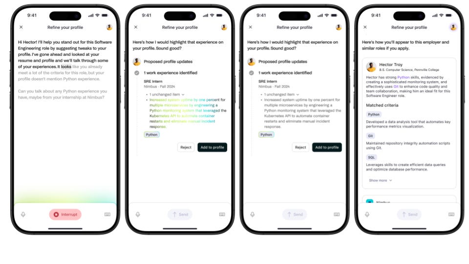 For employers, Handshake’s AI could help sift through candidates to pre-select more promising candidates, show the hiring manager their video clips, then automatically book interviews with finalists. (Lord thinks AI will change how recruiters operate, and how many a business needs, too.)