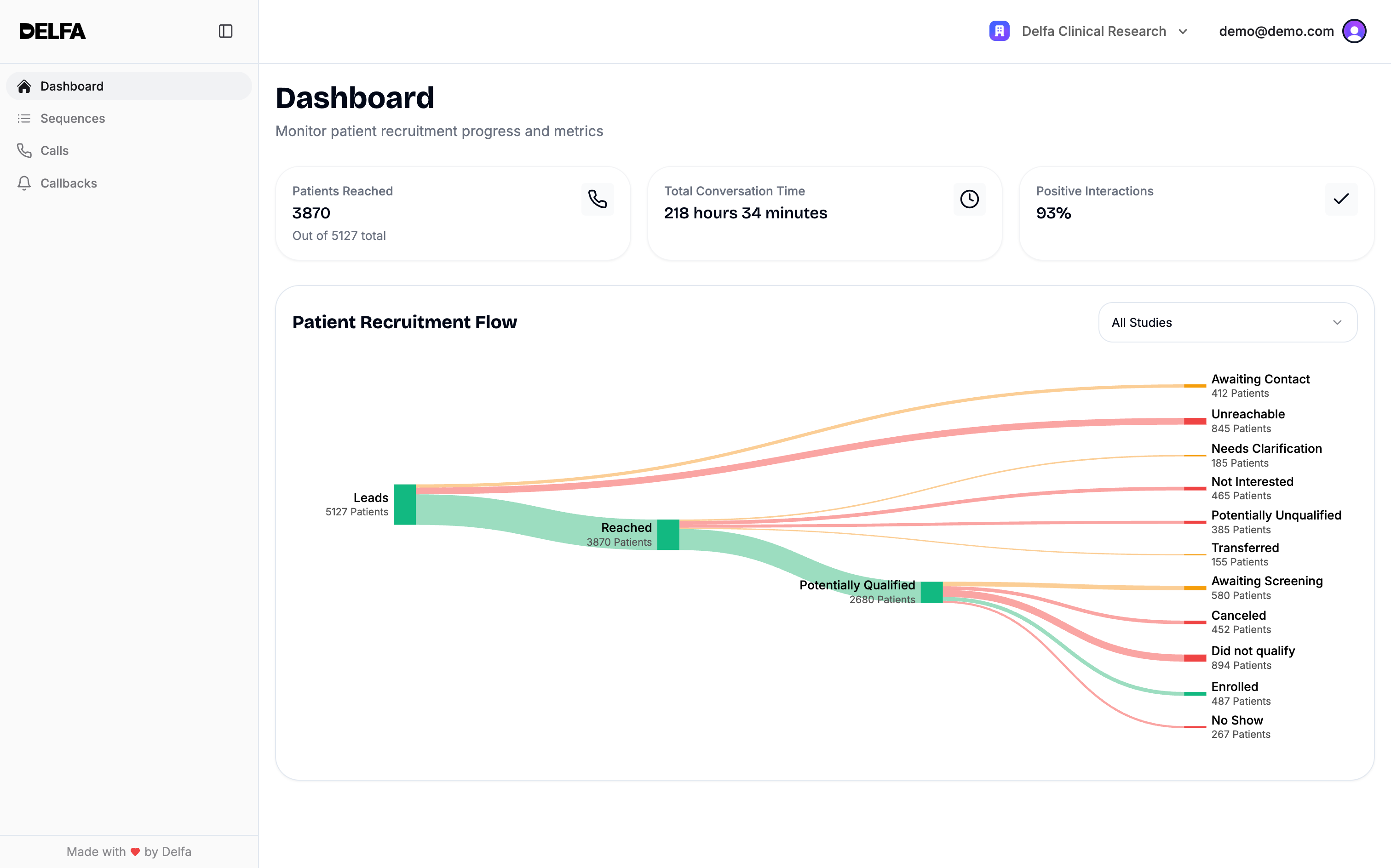 Delfa speeds up the trial process by automating the outreach process to patients, using AI to contact them by phone or text, screen them, and enroll them in a study. Clinical study sites – a whole cottage industry that operates in the background, with facilities often managing trials for multiple large pharmaceutical companies at once – can use Delfa to respond much faster, meaning they lose fewer patients to drop-off.